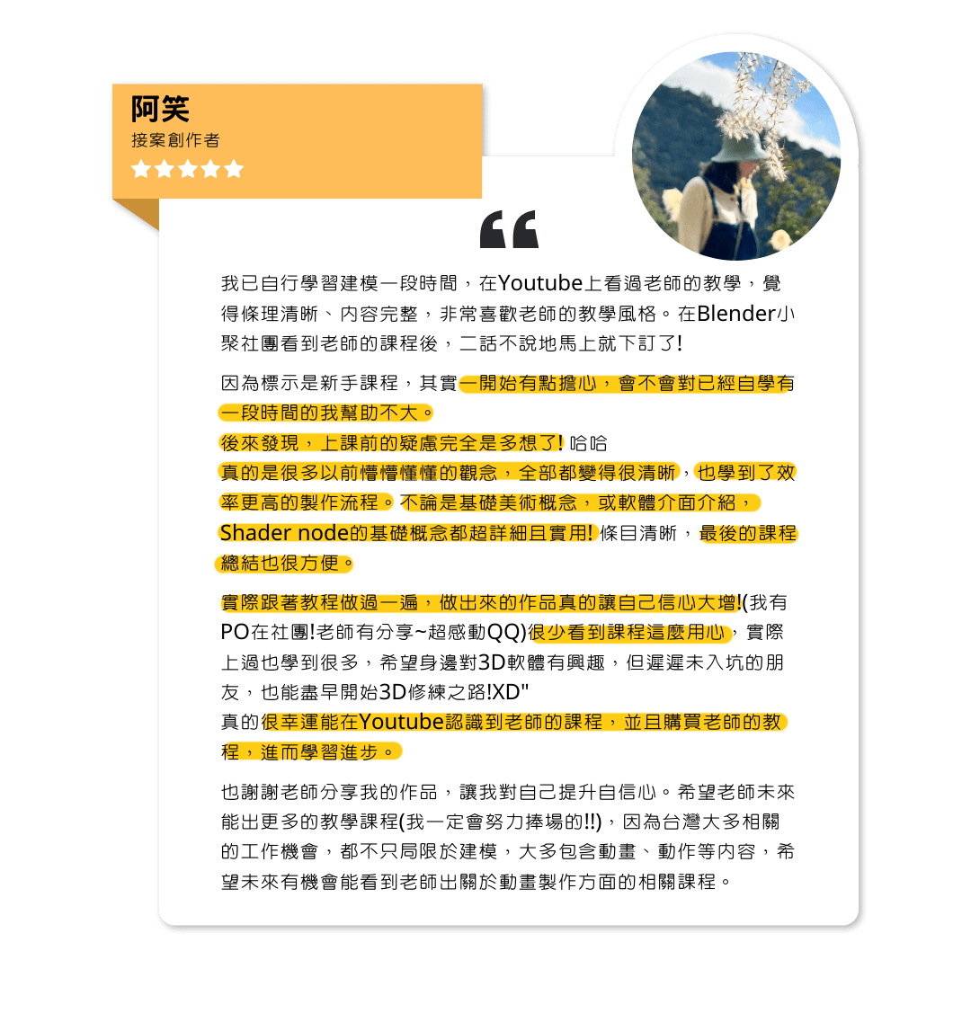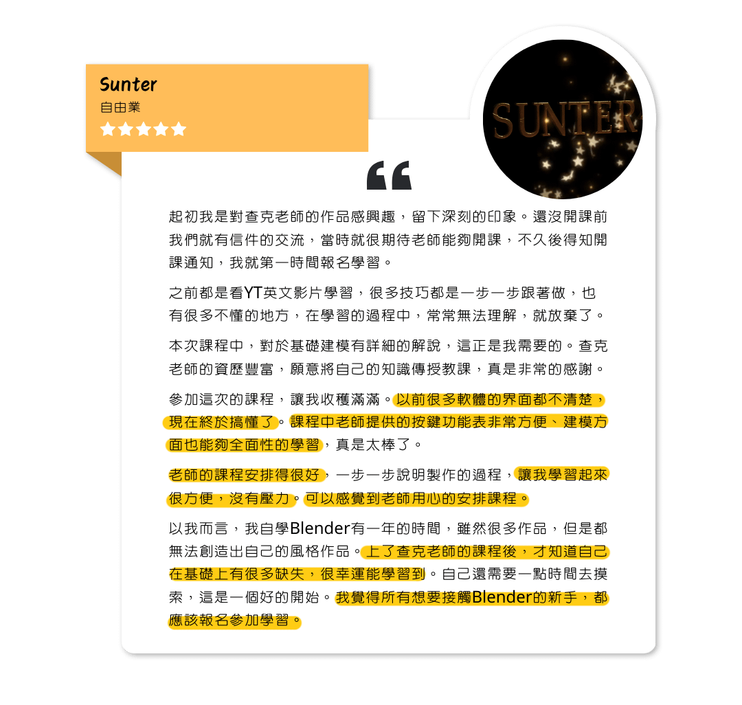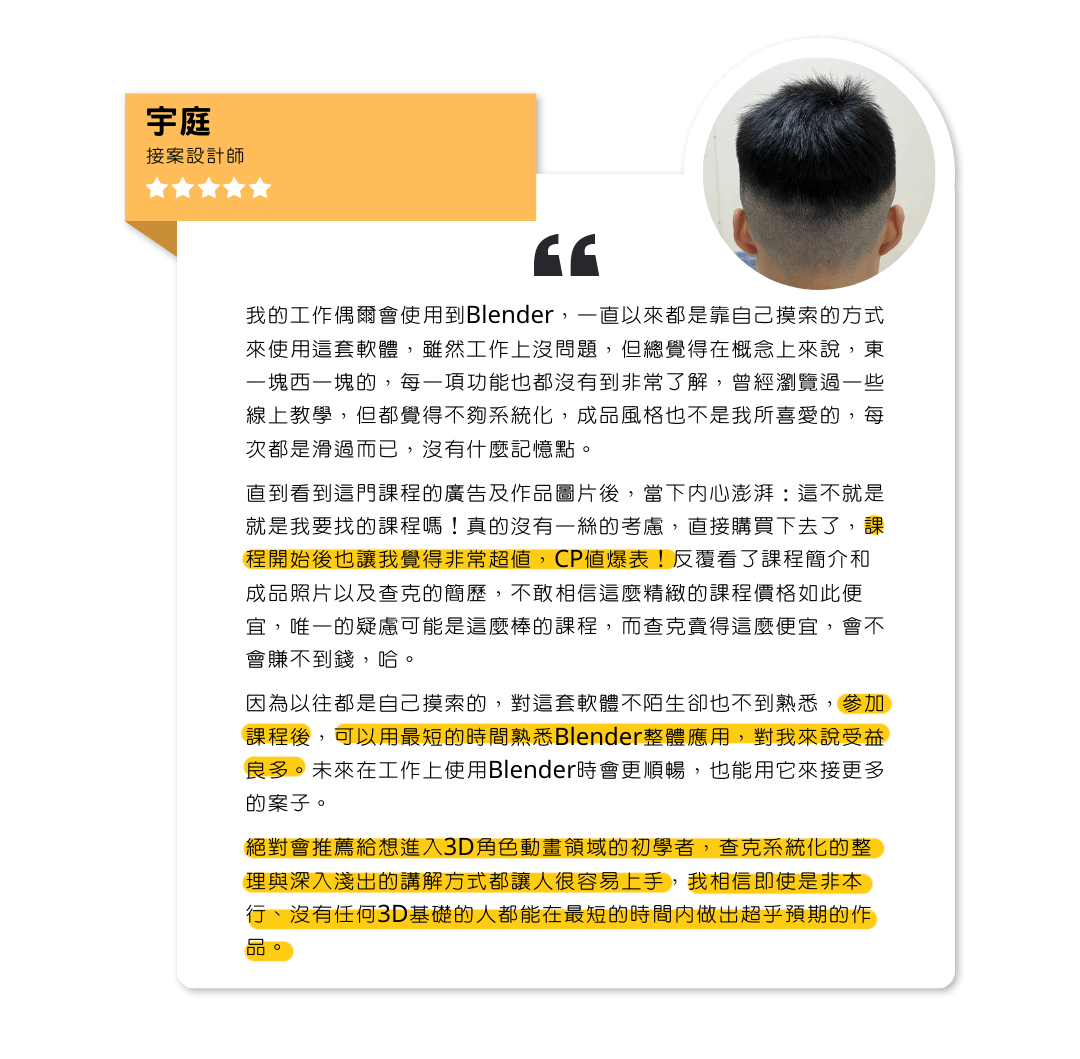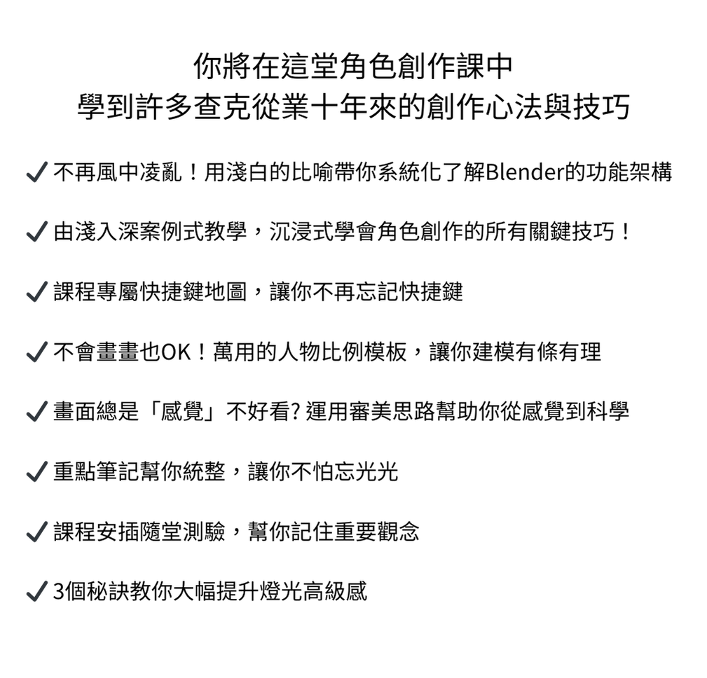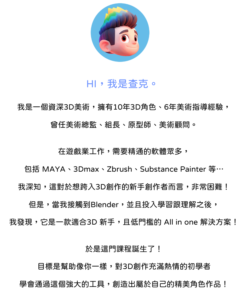 這是查克第一次做課程,我希望能把我所學,化繁為簡,讓更多新手能踏上3D創作之路,我希望能邀請你們跟我一起完成課程,透過你們的意見,讓這門課程更加完善,讓Blender能被更多想學習3D製作的新手學會。
